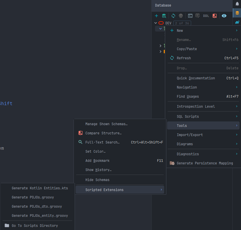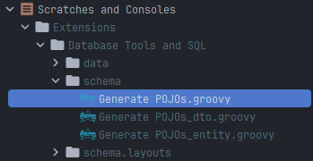 Database를 연결하면 Generate POJOs.groovy 스크립트가 생성됩니다.